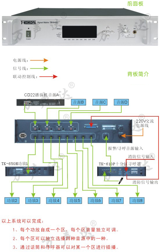 • 可实现多音源分区广播
