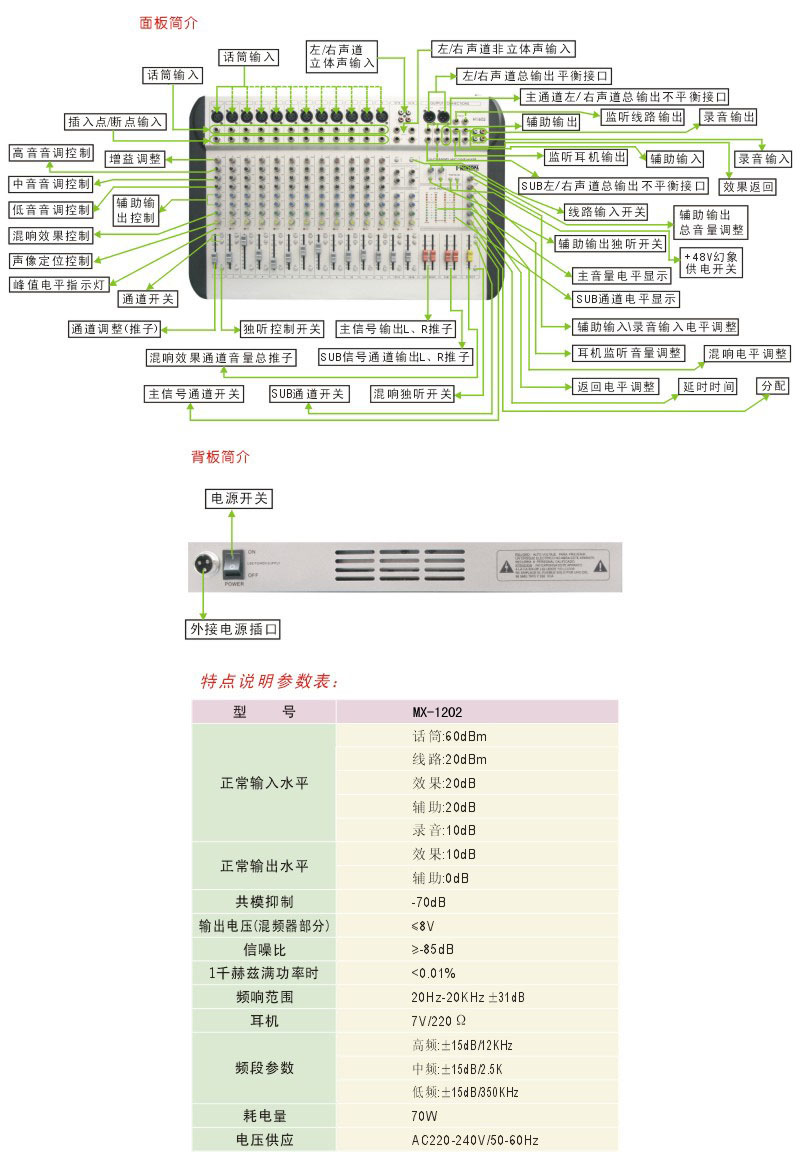 特点说明: 三种调音台的尺寸如下 (长×宽×高):MX-602: 340×350×65mmMX-802: 350×400×65mmMX-1202:350×620×65mm