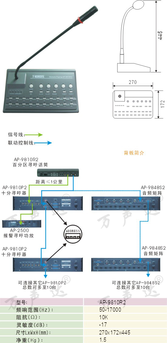 • 可遥控10台AP-9810P2十分区寻呼器、AP-9848S2音频矩阵