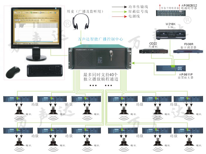 2. 根据实际需要,和软硬件的配置,支持任意区域的独立手动同步播放,编程自动播放,任意的优先插入话筒,设备,文件播放。
