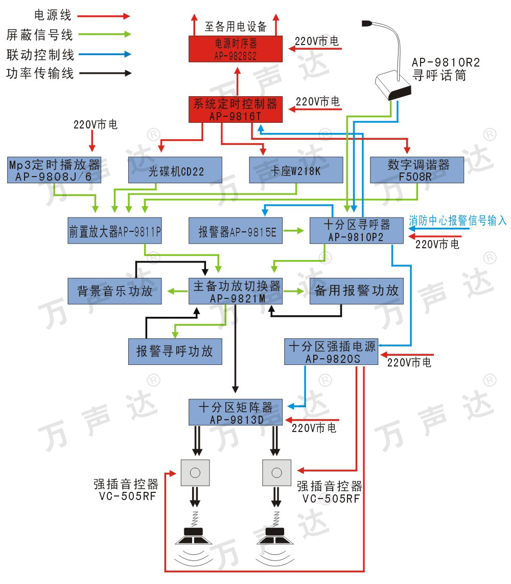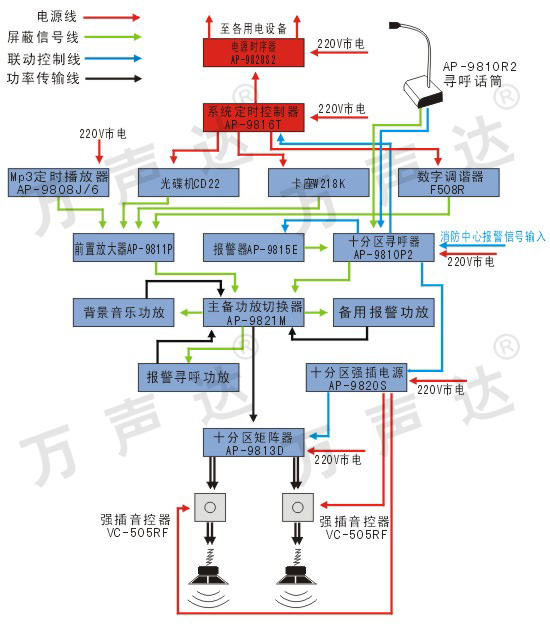 十分区播放、十分区寻呼、十分区强插报警、主备功放切换、系统定时(音源/9828S/9816T/9811P/9815E/9810R2/9810P2/9820S/9821M/纯后级功放x3/9813D/音控器/话筒/喇叭)