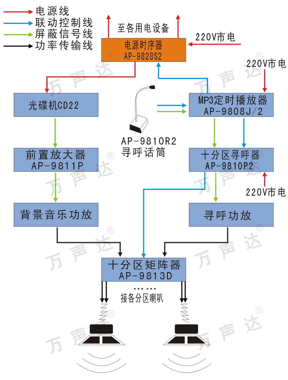 MP3定时分区播放方法-----(音源/9828S/9811P/9810R2/9810P2/功放x2/9813D/话筒/喇叭)