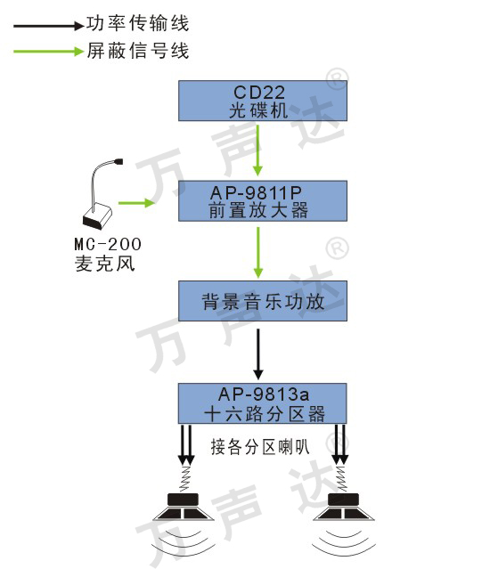 十六分区播放,十六分区广播-----(音源-话筒-9811-功放-9813a-喇叭)