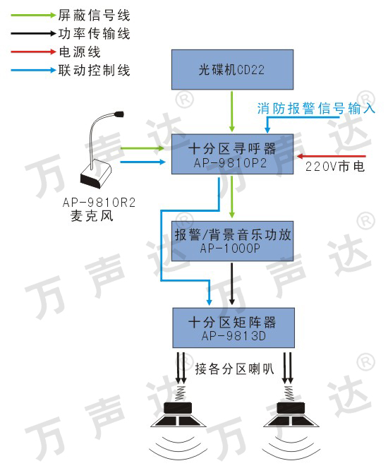 十分区播放,十分区插播-----(音源/AP-P功放/9813D/9810R2/9810P2/喇叭/话筒)