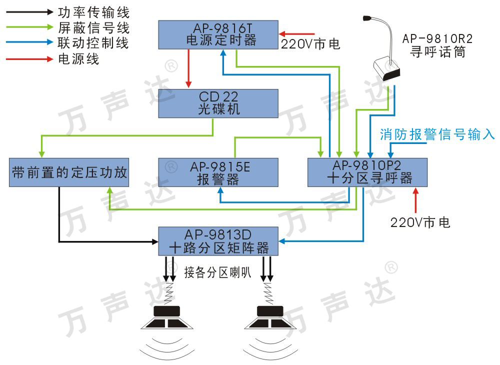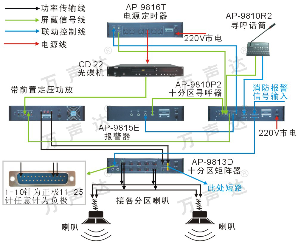 十分区播放,十分区插播,十分区报警,音源定时播放-----(音源/AP-P功放/9813D/9810R2/9810P2/9815E/9816T/喇叭/话筒)
