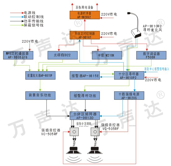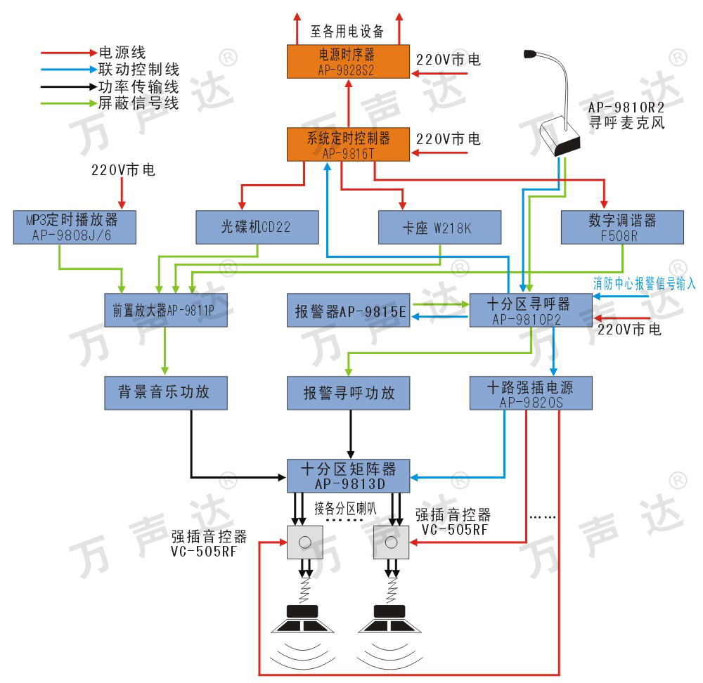 十分区播放、十分区寻呼、十分区报警、强插报警、系统定时-----(音源/9828S/9816T/9811/9815E/9810R2/9810P2/纯后级功放x2/9813D/9820S/强插音控器/话筒/喇叭)
